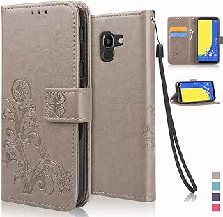 achoTREE Coque Samsung Galaxy J6 2018, Chanceuse Fleur Cuir Premium Flip Housse pour Samsung Galaxy J6 2018 Etui Case Portefeuille PU & TPU Gris 5.6 Pouces